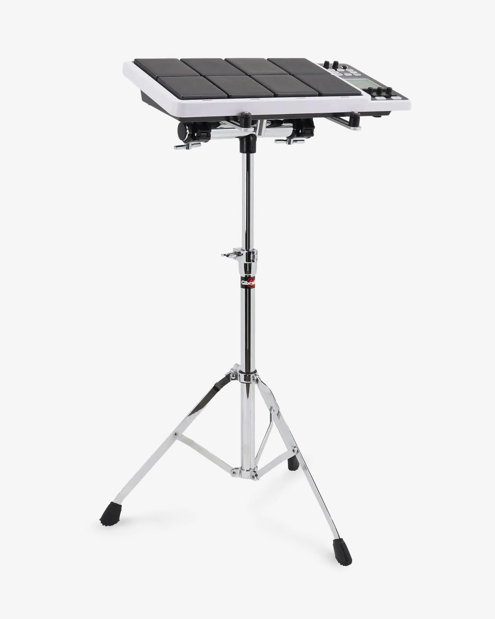 A versatile stand designed for laptops, MIDI controllers, samplers, and other electronic equipment, offering adjustable height and secure mounting.
